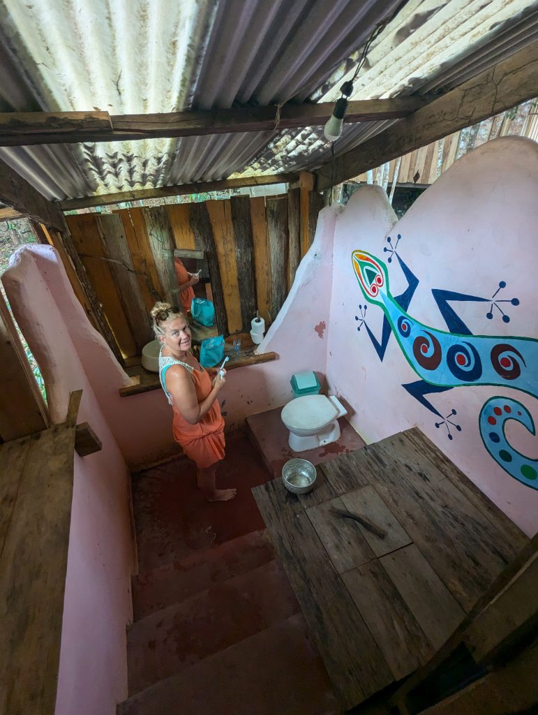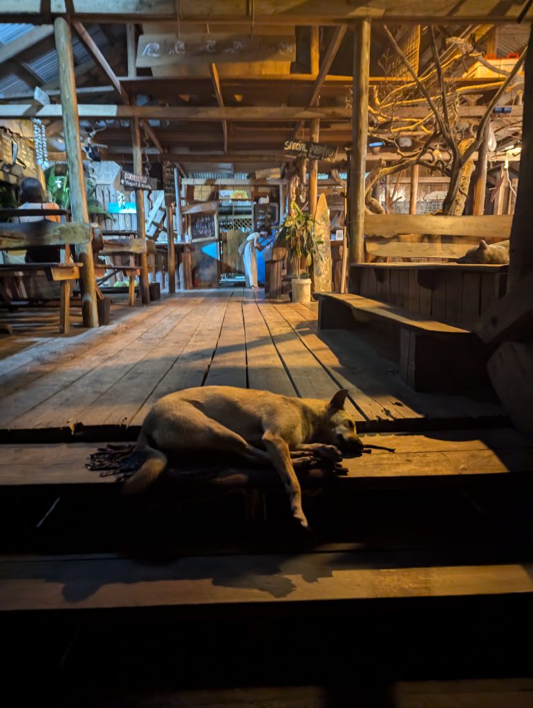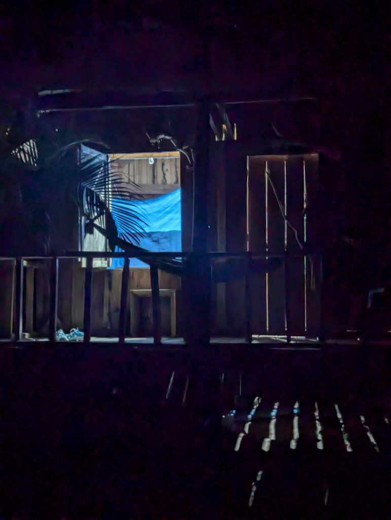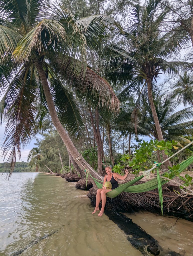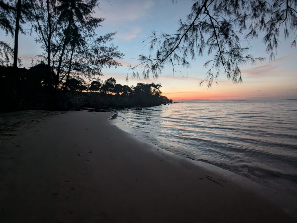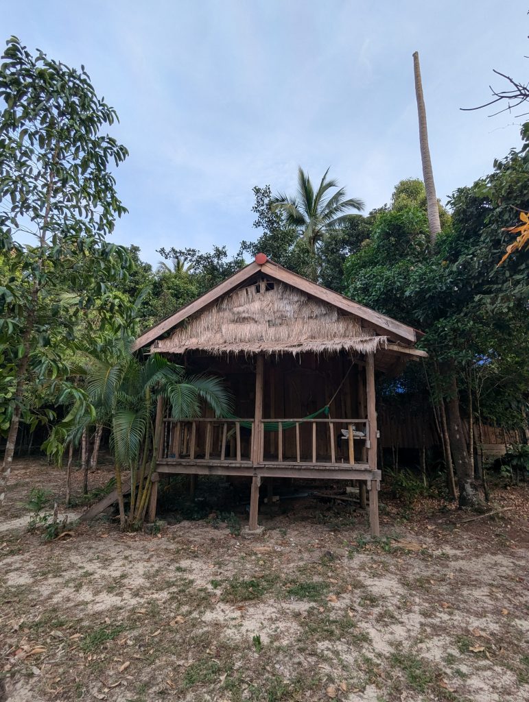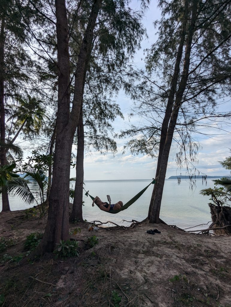 We followed the signs to reception which was a Robinson Crusoe style  beach bar constructed out of palms and driftwood and held together by natural rope and some structural hammocks. It was ace, off grid, solar power no wifi. The owner, a real life Robinson Crusoe greeted us and booked us in and showed us the various systems for how life worked at lonely beach. He then took us to our hut which was all wood, on stilts with a perfect rustic vibe. Night was falling and the mozzies were starting to be pests as he showed us the traditional Khmer bathroom fitted with an untraditional western toilet throne. There was a large tank of water and a metal bowl, the shower worked by filling the bowl with water and pouring it over your head, the ‘toilet paper’ worked by filling the bowl with water and washing your bits, the flush worked by filling the bowl with water and pouring it into the toilet, the wash hand basin worked by filling the bowl with water and pouring it into a cocunut shell with a small hole in the bottom allowing a little stream of water out to wash your hands in. The hut had wooden shutters that could be opened including at the head of the bed which opened right up giving views of the very near beach. Outside there was a verandah with a bench and a hammock.