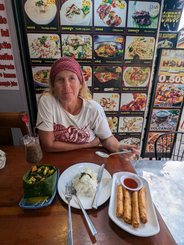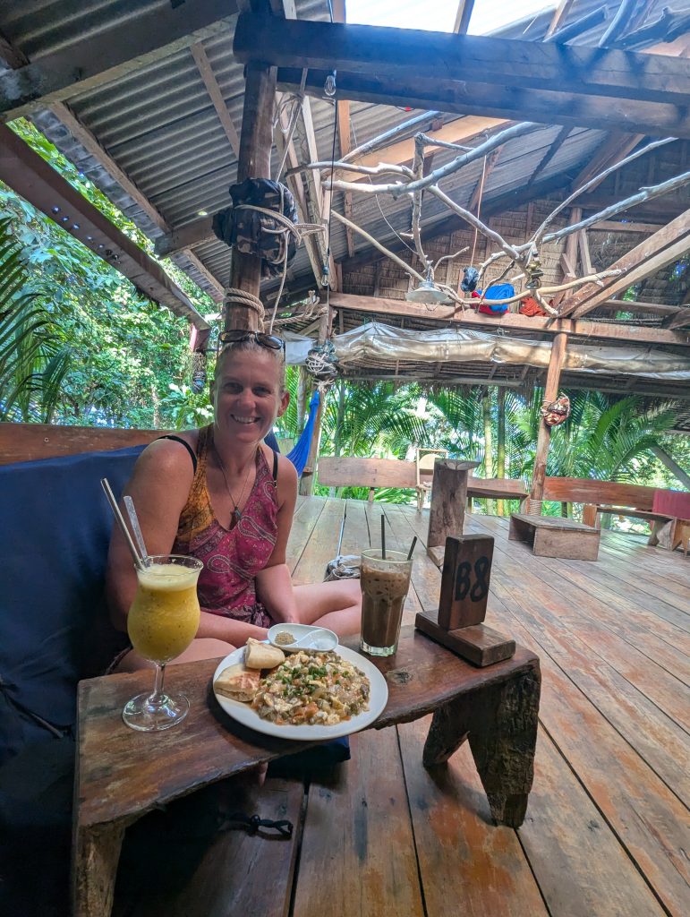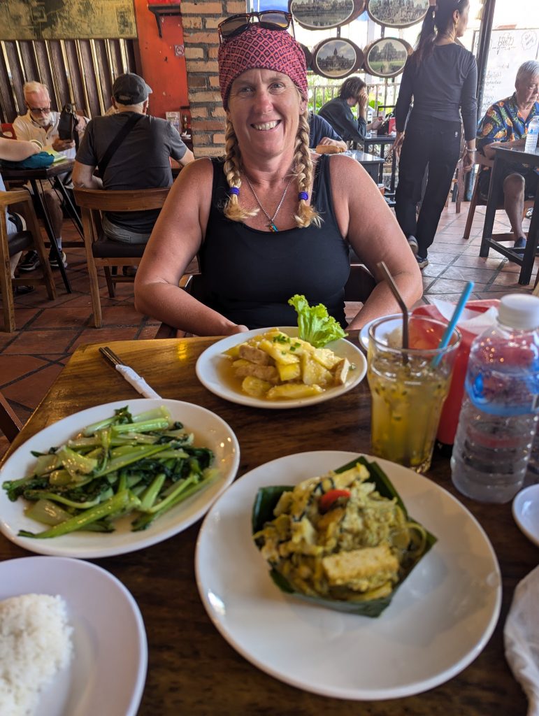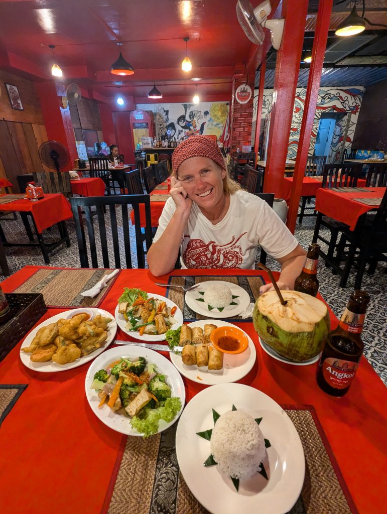 We had lunch, tofu and island salad sandwiches (lovely home made flat breads) and then repeated the above island rota. At this point we noted a giant orb spider had spun a web across the path to the beach bar. Not far off hand size and chilling at face level we made note of its location as neither of us wanted that on our faces. Evening came and we chilled on the verandah and watched the sunset thought the palms and chatted about this and that. After a Khmer shower we walked to the beach bar in the dark, phone torch on, looking for the face clinger, there he was same spot and we leaned and ducked past him. That is not something I would have thought I was capable of, old me would’ve had to find an alternative path! Dinner arrived and the owner and chef tested a new dish on us they were thinking of putting on the menu. A fusion type of lentil dhal, it was very tasty indeed and was a nice change to the stir fry style curries.