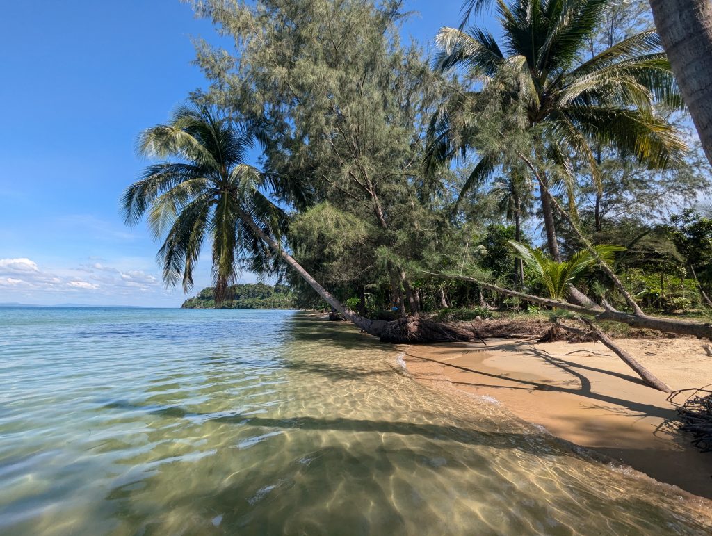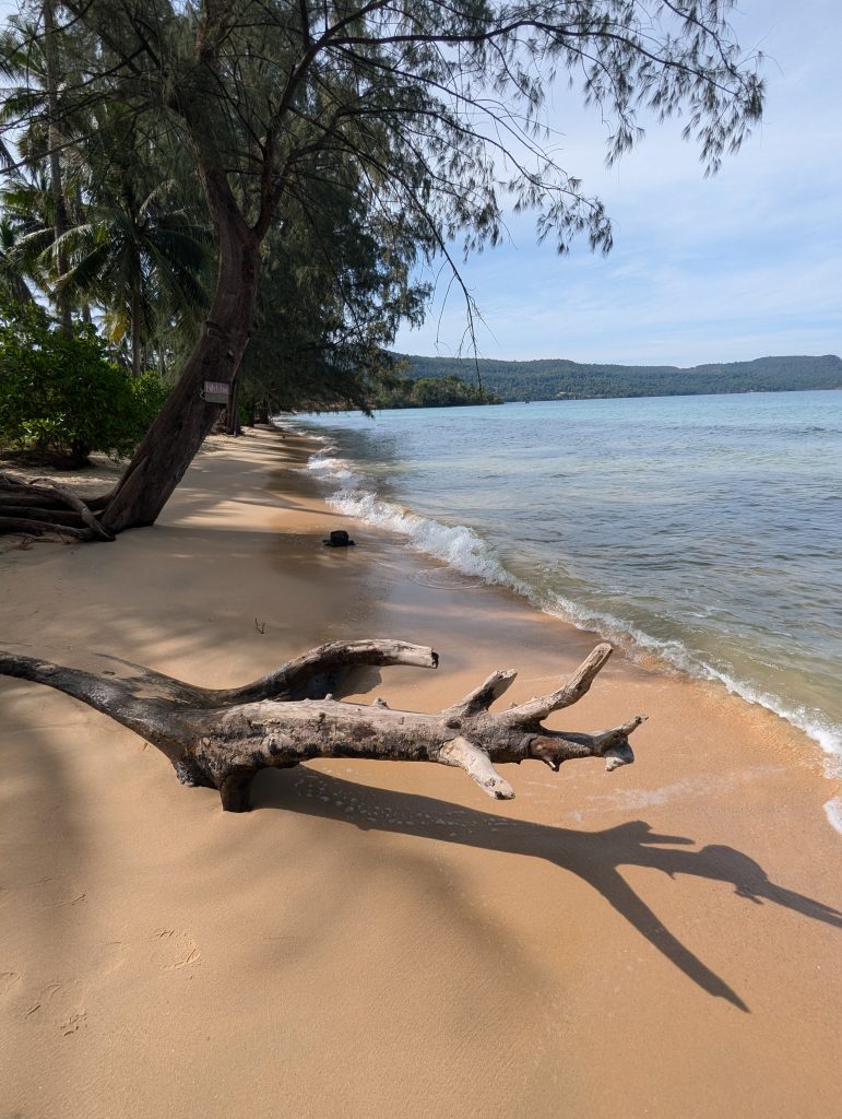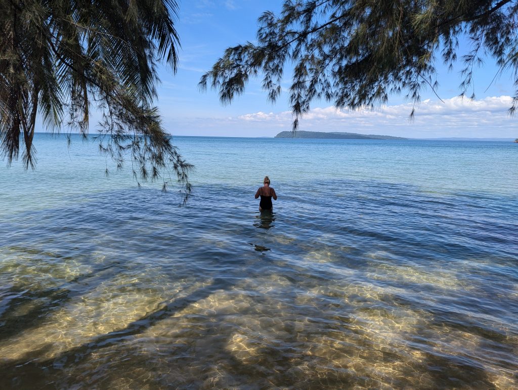 I was in Emma’s dad’s shed trying (unsuccessfully) to identify some animal droppings, feeling perplexed. It was dark but there were lazers of light shining in through the gaps in the planked walls. I did not know what the droppings were and was frustrated and disappointed in myself. I stepped out into the sun and joy had brought a plate of melon with light purple flesh that tasted of parma violet. Cold sweet and delicious. I closed my eyes and when I opened them realised I had been dreaming. I was now staring up at a parma violet coloured mosquito net that was draped over our bed and had successfully saved us from insect attack for the second night in a row. Lasers of light sliced across our bodies shining in from the gaps in the plank walls, adjacent to the bed was an unidentified animal dropping. A mild annoyance at not knowing who it belonged to washed back over me. I bent my neck and looked out through the open shutter above the bed and saw the palms swaying above the beach. I let the dropping frustration go. I tuned into the sounds, waves gently lapping the shore and the strange and unfamiliar bird and insect noises. After spending 50 years in the UK this was like waking to the sounds of an alien planet, which I guess in some ways it was. Lonely beach is a marmite place, I think you would love it or hate it. I like marmite. I like lonely beach. We took it in turns negotiating the Khmer bathroom mobility assault course and then swam a length of the bay, there was a bit of wind and chop so it was bouncy like home but crystal clear and luke warm bath temperature.