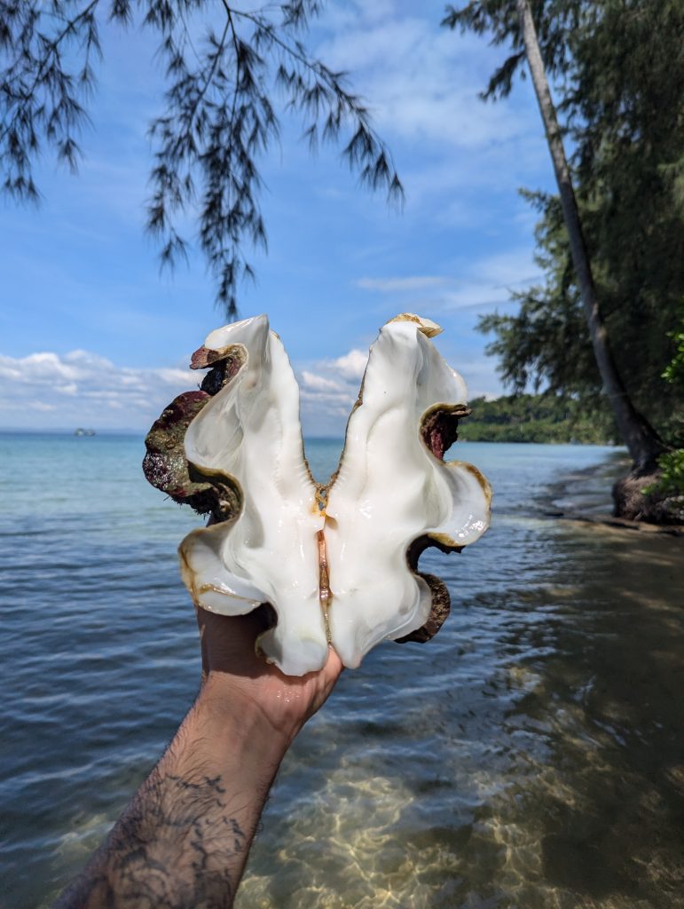 Island life is pretty easy. Chill in a hammock, eat, get eaten (mozzies), swim with the fishes, drink, doze, sleep repeat. Today’s swim in the aquarium uncovered 2 new things. An alive version of the previous clam shell I found, bright neon blue clam flesh radiating from the wave like opening between the two shells, like something out of avatar. I stared at it in wonder for at least 10 minutes. It seemed so unlike other bivalves (shell fish living inside 2 shells linked together by ligament and muscle) the flesh was so big it was unable to fully close the shells as a protective measure and this answered the question that had puzzled me when I found the empty shell yesterday……that when pressed together the two shells did not seal perfectly as you would usually expect. I also found some whelk like shells that when you picked them up had a ‘stopper’ that resembled an eyeball, mother of pearl with blue green it looked like some kind of horror gobstopper.