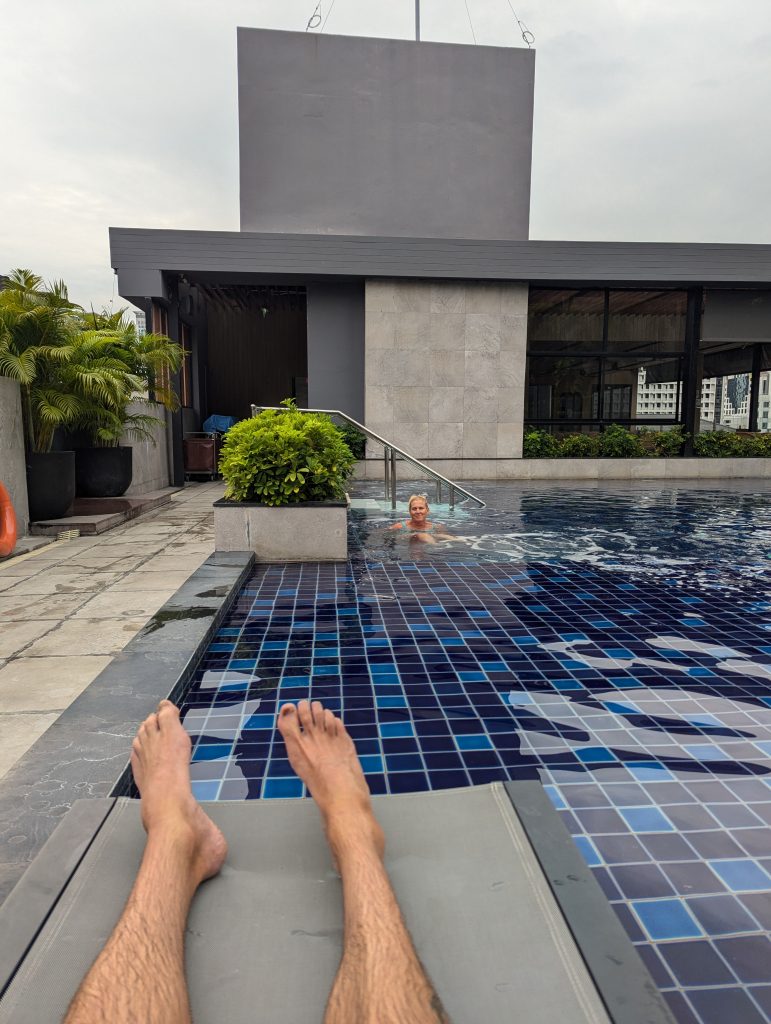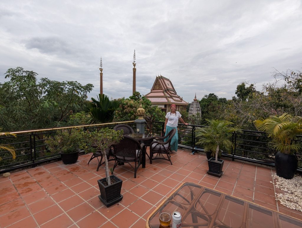 After dinner we headed for a Cambodian foot massage which was the first massage without relaxing music. Rap and dance tunes exploded into the room from the noisy clubs outside. As we left and walked the street Emma was far enough away from me for someone to think I was on my own and offered me a girl who would ‘love me long-time’. It started to rain, heavy, so we jumped into a Tuk Tuk and arrived back at the hotel which was an oasis of greeness and calmness compared to the crazy world outside.