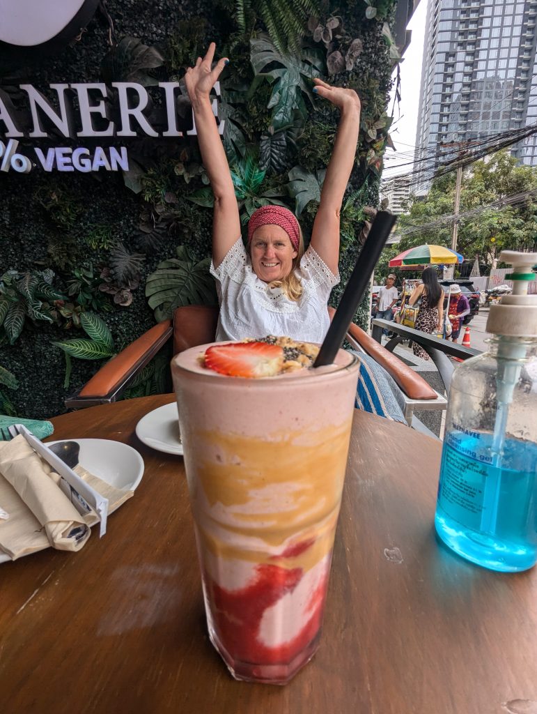 The flight was quicker than scheduled due to a tailwind, so only 45 minutes. During which time the staff served everyone a meal (vegan tofu rice and veg for us with a dessert), served everyone a drink of coffee/tea and cleared up. Arrival at Bangkok was also straightforward and we were soon in a taxi, back in the crazy Bangkok traffic commuting the 43 km trip back into the city centre. Our taxi driver pulled out some local smooth moves down backstreets to get us to our hotel shaving off over 60 minutes from googles predicted journey time. Great to see the algorithm defeated by an everyday human!
