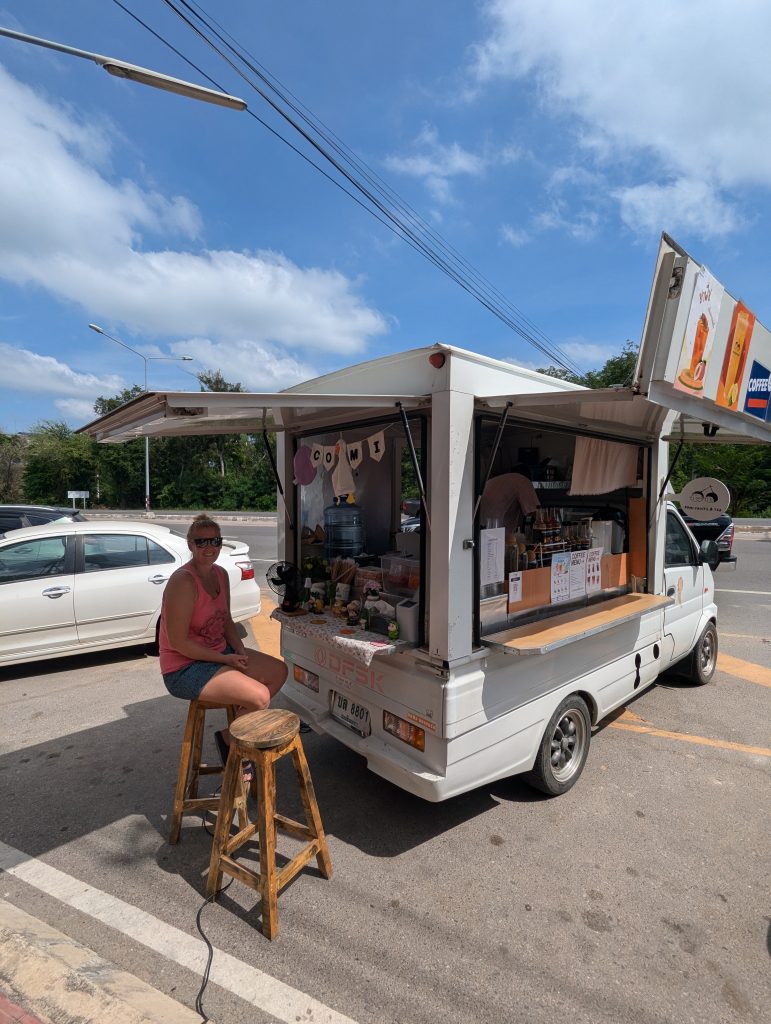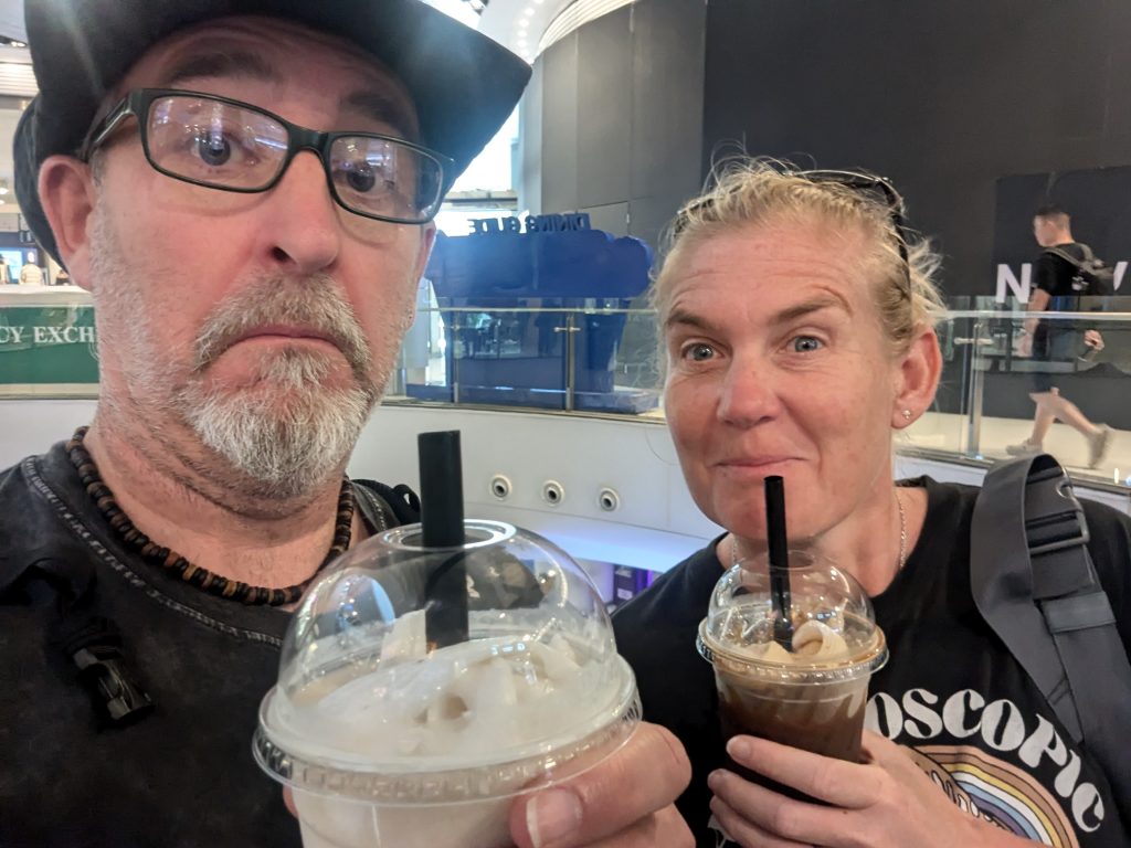 Yes! 6 days in and our first full night sleep! We did stay up until 01:30 though to increase our chances of sleeping through and it seemed to work despite being a particularly muggy night. Sleeping whilst sweating does not come easily to my Welsh blood. Once up, you know what comes next….the coffee hunt! Today we walked to a different place called Good cup, sneaking past no name cafe so as not to upset the owner. Good cup, it turns out was an apt name. Em had a oat capaccino and I was feeling wild so went for something new which was an iced oat matcha latte…… to match my new fancy haircut. What has become of me? There was a bit of confusion ordering until an Englishman (5 years in Thailand) stepped in to help us. You could tell he had been out here a while as he was wearing a woolly jumper and we were sweating in vest tops.