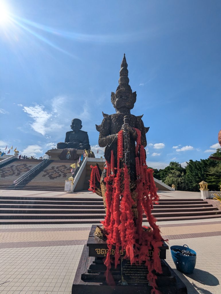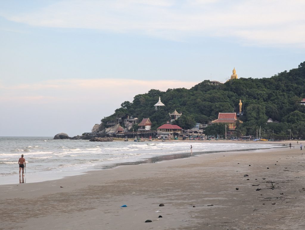 After catching up we cooled off in the pool before heading off for a walk around the local lake and a look at the local beach. A long stretch of white sand with a few small islands peppered offshore they were quiet at this time of day. The point at one end of the beach was covered in green jungle with a giant golden Buddha strikingly sat on top of the hill.
