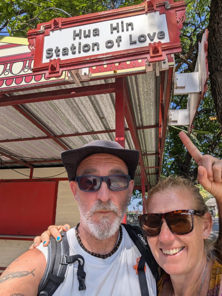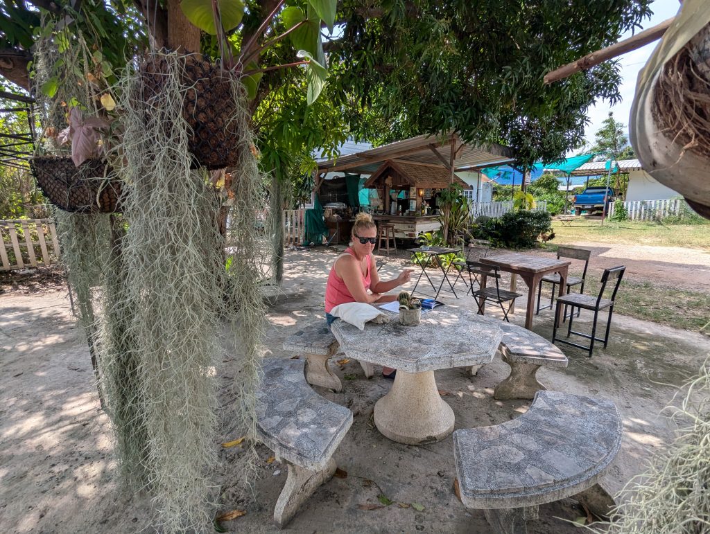Emma struggled to sleep again last night so we ended up arising very late (for us)…about 11 am. We went on a coffee hunt thinking our guests were still in bed (turned out they were in the room next to us waiting for us to get up!). Stepped outside and pow the heat hit me with that surprise shock….again. We walked down the road to a place called ‘no name cafe’ which seemed to be a coffee truck in someone’s front garden and it turned out that someone made good coffee which put a smile on Ems face. I had an iced green lemon tea which was new and nice, if a little sweet for me (sugar syrup seems to go in everything here, I think the thais have a sweet tooth and I haven’t seen a lot of candy this this must be how they get their hit, along with putting sugar on and in their food). We sat for a while amongst long stands of wispy beard like air plants and free roaming chickens (maybe anti snake tools?) watching some asian doves softly pick through the dust.