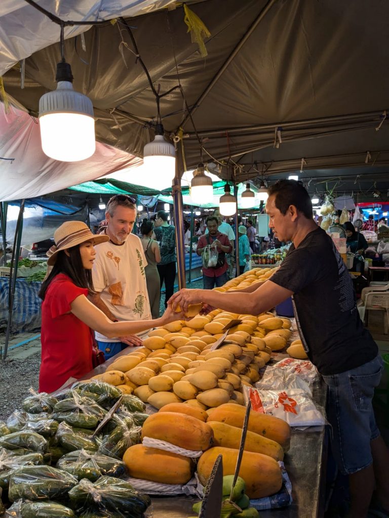The fun didn’t stop there as we went on a family outing to the night food market. We arrived just as darkness was falling and the colourful lanterns were just starting to twinkle. The place was packed with food and people. We were all hungry, but I had a full storm of hangriness brewing, so we opted for a quick smash and grab first course to stave away the edginess. There were all sorts here and if I still ate meat or fish there’s a good chance I would have ended up bankrupt. First course was tornado potatoe (twirly potato on a stick sprinkled with seaweed salt) corn on the cob, tofu pad Thai and iced berry smoothy. Devoured with gusto and very delicious. The bustle and excitement for me was intense, I felt like a kid in a toy shop, with a gold card! Next up Em had some gyzoa and I had spicy pounded mango salad, delicious and as I just I was saying to the others that it was not too spicy a chili bomb detonated in my mouth. There were some chilis hidden in there. Small ones that like small dogs, have big attitudes! Emma then had bubble waffles and her Dad and Joy returned to the table with some treats for me. A legendary durian fruit and some mango sticky rice. I held my nose shut as I ate the durian and felt like I’d won the durian lottery, it tasted delicious to me, like a dessert version of an avocado. I bravely sniffed it and there was no really bad smell (this was a Chinese durian as Thai were not in season and I was told they weren’t anywhere near as wifey as the real deal). The mango rice is a Thai desert that resembles a dry rice pudding. Coconut cream poured over the rice spooned into your mouth with a piece of juicy fresh mango is a magnificent experience. I can see why this is so popular. What a day, what a night!