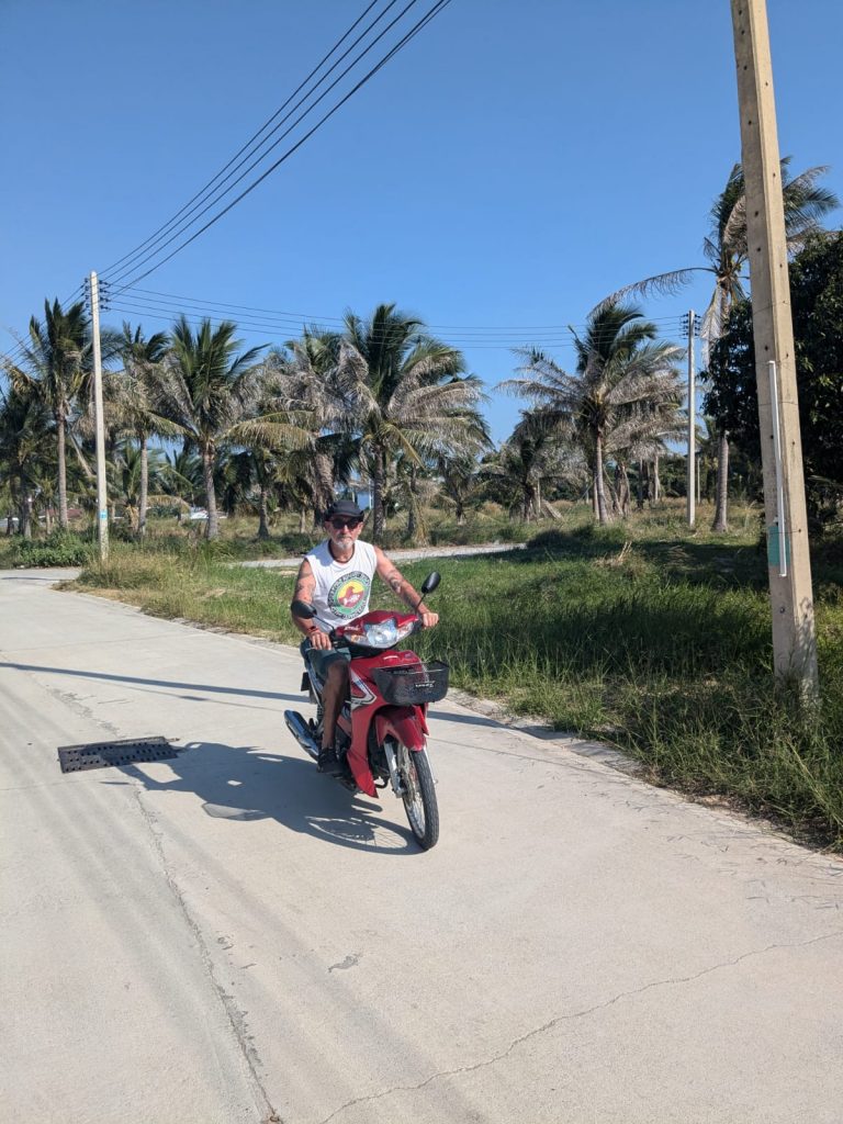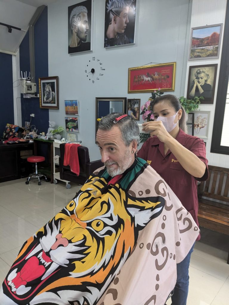 When we got back to the house me and Emma decided to go for a stroll and I ended up getting my hair cut at a Thai barbers. I hadn’t had a haircut in the barbers for around 10 years (I’ve been cutting it myself or forcing family members to do it). It was quite strange going to a barbers who could not speak my language. I showed a picture of the style I wanted and they nodded and smiled and spent about 45 minutes cutting my hair with various razors and shavers including a cut throat that was skillfully scraped across my skin while I held my breath and tried not to swallow, sneeze or scratch that itch on my nose. They had made an honest attempt at styling it to my request, unlike the barbers back home who give you the same 1930’s cut whatever style you request. They were precise and highly skilled I was more than happy with my cut (and beard trim) and paid 200 baht (100 Baht is just over £2) and gave a 100 Baht tip that I wàs later advised was too much but they were so competent I was happy to pay. Em got her nails done and I headed back to start cooking dinner (seared king oyster mushroom, salad and sweet and sour veg – bamboo shoots, coconut palm, kale, pepper, water lilly shoots and cashews with noodles topped with crispy shredded tofu). We only had one meal so far today (and a few snacks) definitely eating less in this heat. Everyone here including the dogs are trying to hide out of the sun to stay cool but you just can’t escape it, it’s pursues you relentlessly and when you think you have shaken it off your tail it’s there around the corner waiting for you. And this is winter……it just gets hotter! For me it’s the first time in heat without any sunbathing and that seems both strange and normal.
