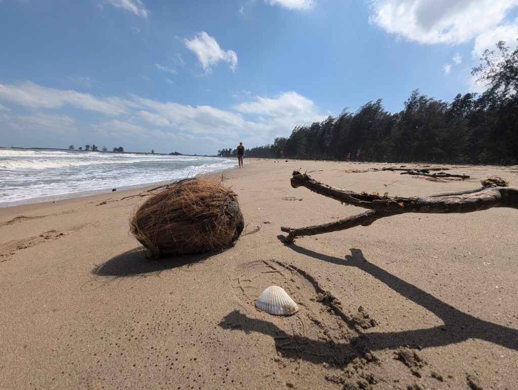 After we finished our drinks our hosts picked us up to take us to a forest park to satisfy our need for some nature. On the drive there we spotted a huge shiny snake gliding across the road and I fought every urge in my body to jump out of the car to get a closer look, we couldn’t tell if it was an ok snake a bad snake or a really bad snake. It was still exciting watching it through the car window as it slowly dissolved into the grassy verge. This was a good start! We pulled up into the forest car park and walked through the trees heading for the beach. I chased a few bugs around trying to get a picture and then I saw a giant hornet and started skipping after that hoping it would land so I could get closer but it never did and I eventually let it go its own way and caught up with the others now on the beach. The beach was a long arc of sea smoothed sand stretching from a forested headland to a man made breakwater at the far end. The drift line was like something out of Robinson Crusoe….littered with coconuts (some hairy some smooth) bamboo and strange shells. It was pretty windy and the sea was choppy with small blown out waves. The water was warm and pushing freshly marooned shells in before our eyes. Every now and then there would be a dead silver shiny fish sliding up and down the sand with the foamy water.