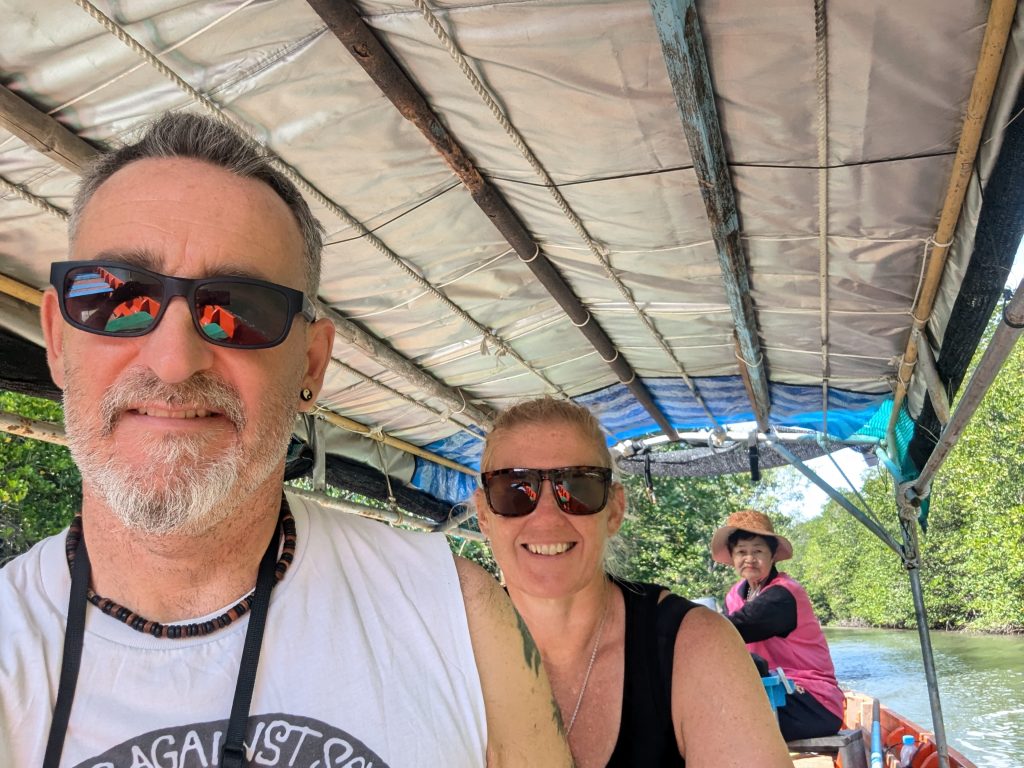 After a lengthy walk we headed back to the car and cafe for coffee number 2 and an iced cocunut water. There were chickens everywhere scratching around and I remembered reading something about them being used to kill any snakes lurking too close to human areas. Then we moved onto a boardwalk through the mangrove and you could easily see why people struggle in mangroves…..it was like a prison…..each tree with 20 or so legs tangled into those of a neighbour it would take you the best part of a day to cover 50 metres. Mangroves are loved by crabs and an info board suggested there were at least 8 species here. Initially they were difficult to spot but once you got your eye in you could get a glimpse of them unless your shadow crossed them at which point they would disappear in a flash back into their muddy holes. Some had bright red claws and lovely blue markings. At the end of the walkway we jumped on a boat and an old Thai lady slowly took us off down the main channel. Within a few minutes a very large snake swam past us, it’s head raised out of the water like a submarines periscope. This was closely followed by a large swimming lizard, you know the ones as long as a large dog and as tall as a medium sized rabbit. There were plenty of egrets about and after about 10 minutes we emerged into a large shipping channel hitting the wake of a small boat and alarmingly rocking almost to the point of no return. As the sea was rough most of the boats seemed to be in the harbour with fishermen on deck repairing nets and smoking cigarettes happy to return the waves of a couple of Welsh tourists. We cruised in close to the treeline and had an excellent view of a large kingfisher that was perched on a branch hanging about 10 cm above the waters surface. The quiet captain had been watching our pointing and spotting and now joined the game taking us in closer to see various birds and a very large lizard who seemed to be tasting our breath with it’s whip-like tongue.