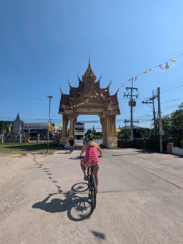 The phone alarms chirped us awake at 7 am having slept through the night. Teeth brushed we jumped in the car for an early morning lift into town apologising to our hosts for their forced early start. We were due to hire bikes and were following the shops (Thai style) instructions which led us straight to the wrong shop. After a couple of phone calls and some searching (where Em managed to obtain her morning coffee) we eventually found our target and we’re introduced to our guide (and shop owner ‘A’) and George who was a hard knock 70 year old Scottish expat. He worked on the rigs and rode his mtb for fun and was fit as a fiddle. George was our sweeper and his job was to ride last and make sure neither of us got lost in the jungle. Next we met our steeds for the day, a couple of basic Giant hardtails fitted with a bottle of iced water. After the safety brief…..which consisted of ‘You follow me’ we were off, rolling into the Thai traffic negotiating a swarm of mopeds then crossing the road through a grand archway into a large golden roofed temple area.