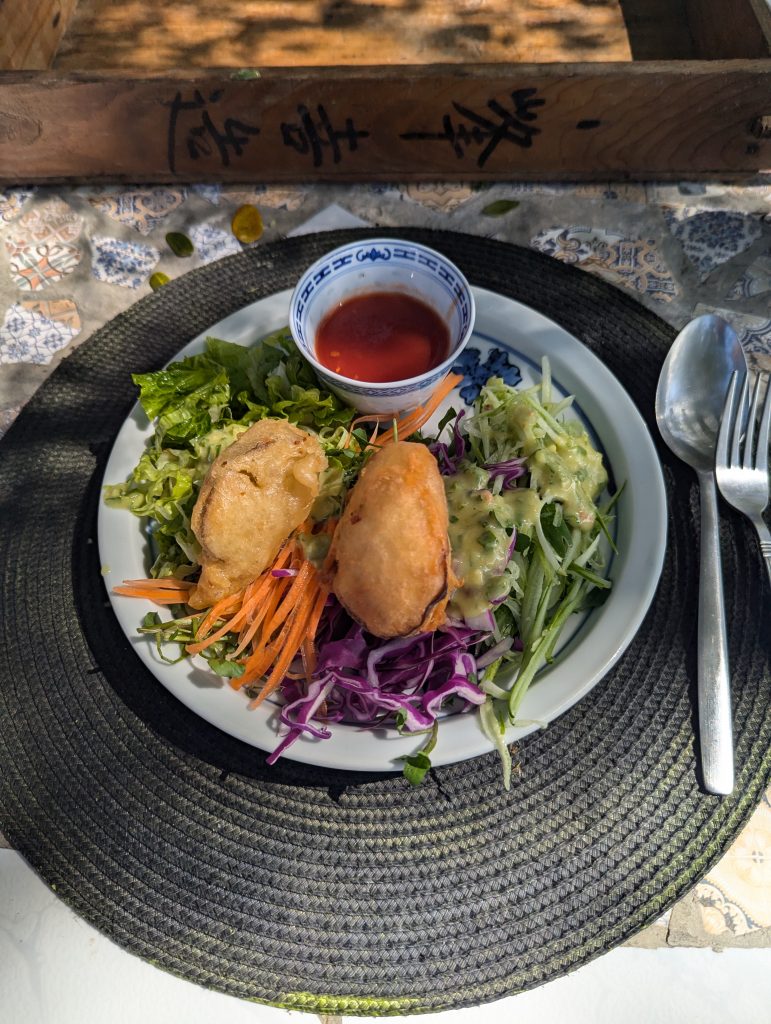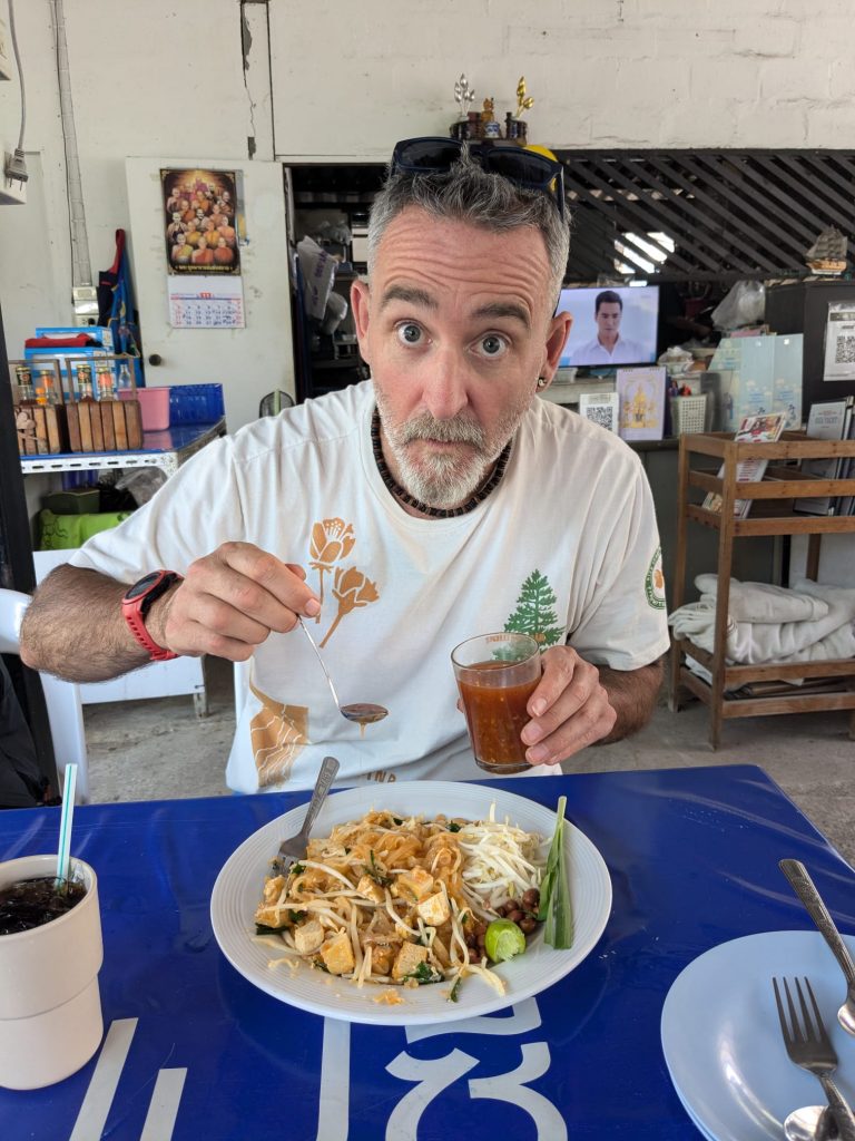 Our guide recommended a coffee shop and Thai food place to us so we set off for an early lunch. The shop had oat milk and Em got an iced coffee and I also treated myself to a rare caffeinated cup to keep the buzz going after the ride. We went to the food stall where the workers were watching daytime Thai tv. The people here are so polite and professional when it comes to service, I have never seen anything like it. They earn their tips for sure but I guess that might be the reward that has evolved this level of service on top of their natural kindness. I had tofu pad Thai and spring rolls and Em had Thai omelette and spring roll. I upped my game and sprinkled extra chilli on my shiny noodles. They were delicious.