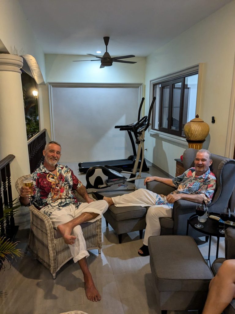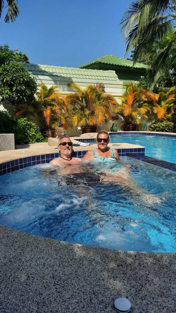 We followed our own footsteps back up the beach and found another track to the main road and then headed home. Before I knew it we were back in a massage house for Thai massage number 2. The Thai ladies seem to love the way I put on their massage pyjammas, take them off and then put them on the right way around. Toady they called me Pappa…..I think short for Pappa Smurf. My lady, Lilly was kind and gentle to me as Joy had breifed her I was a wimp and it was also clear to her I had no idea what I was doing. I was lying there at one point and I could swear it was that spider massaging me. There was no way a human had that many knees and elbows to dig into my poor back and legs! Lilly got a 100 Baht tip and danced off with a big smile on her face waving her note around like a flag. I had made her day and that made my day too.