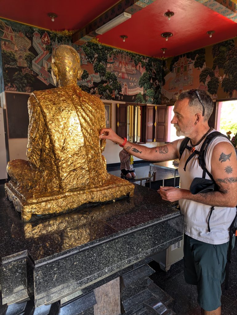 We went to visit the old train station this morning which was beautiful…..puts our train stations to shame. Beautiful buildings and planted with some lovely mature trees standing outside as sentinels. We then visited the temple and made some offerings to the Buddhas, lit some candles and incense and rubbed some gold leaf on all 4 Buddha statues.