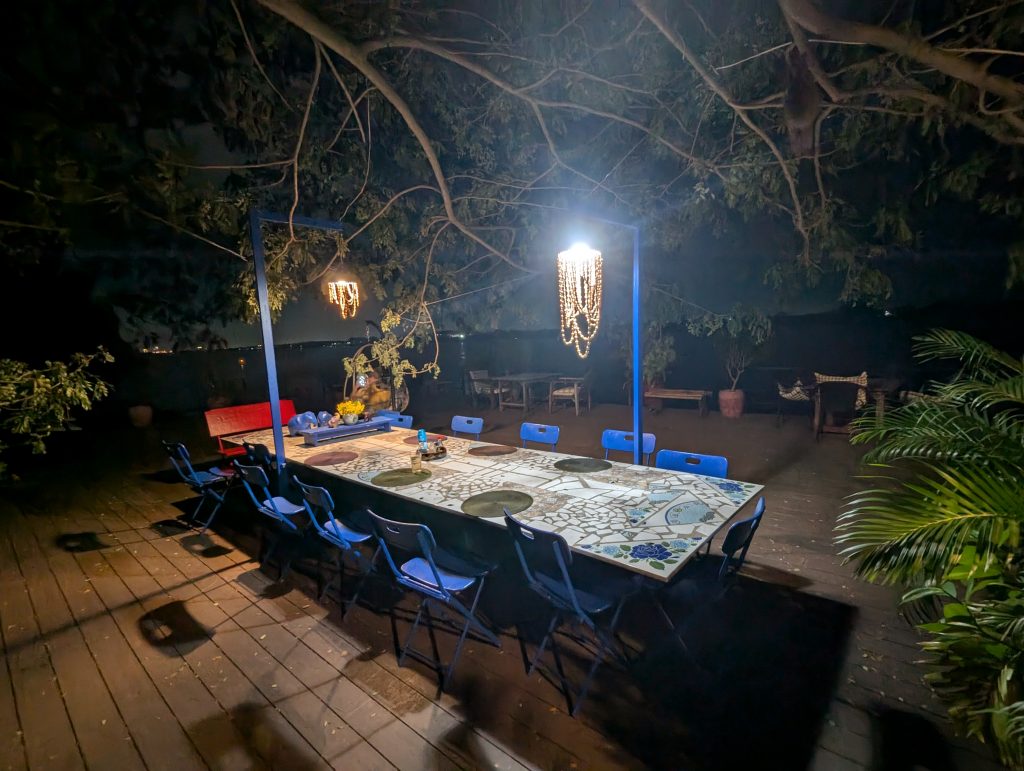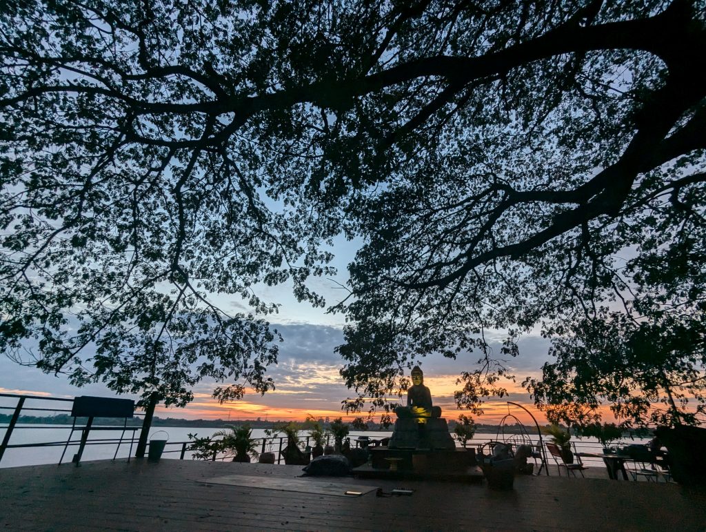Eventually Mr Tom started to turn down what looked at first to be a hole in a wall but as we got closer we could see this was a super narrow rutted dirt alleyway. As we edged along the rutted track locals squatted in the dust staring at us, to the left someone was butchering a chicken that was hanging from a wire. At the end of the track we were dropped off in front of a huge solid metal gate. The gate slid open and we stepped into an oasis and we’re greeted by the owner Jan who gave us a tour and got us settled. We were just in time for evening yoga on the deck beside the Mekong river as the sun set. We were under a beautiful tree and enjoyed a hatha session to stretch out after our travels. By the end of the session the mozzies were out, bats were flitting between the tree branches and a gecko was emiting a strange bicycle horn type noise.
