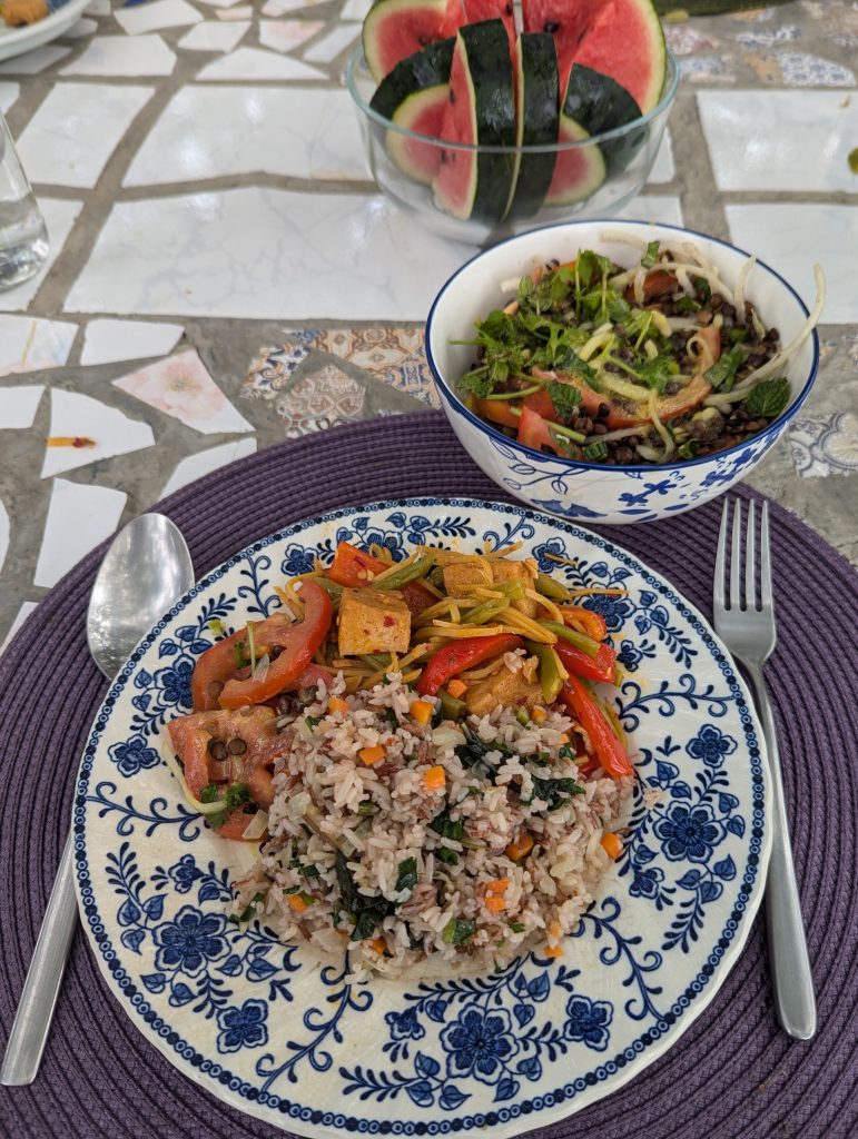 We returned home for some more conversation before being treated to a lovely Thai meal which included my first taste of black rice with a tofu and Thai eggplant curry and mixed veg and tofu stir fry. Delicious. As night fell photo shy geckos appeared on the walls, tiredness gripped us and we headed to bed for an early night.