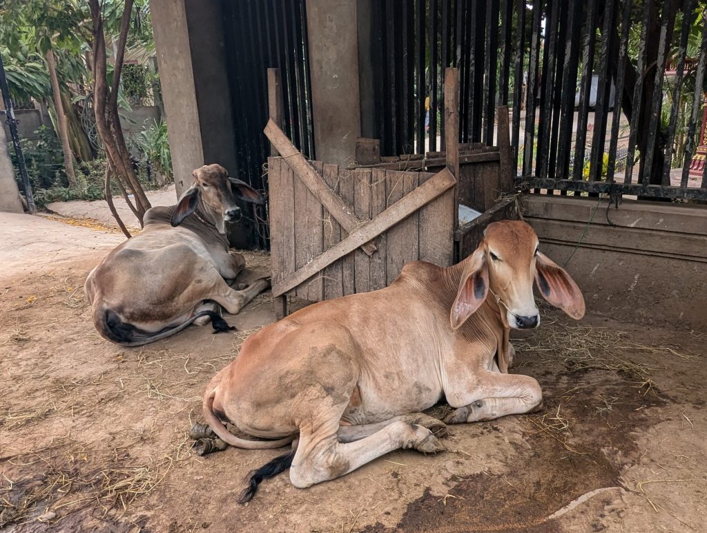 The gong rang out declaring lunch was served and we ate a delicious lentil salad, green bean and ginger curry with vegetable rice. Me and Em decided to go for a walk and as soon as we slid the gate open we were confronted with our first dog, the first of many. We strode confidently past it and it settled down back in its shady spot. 30 yards later a dusty little 3 year old girl wobbled barefoot down the dirt track towards us shouting allo allo allo, she had all the swagger and confidence of an airport taxi driver and when she arrived at my feet she held her dirty hand out with a big smile, I smiled back and touched her hand and her face lit up with joy as she said one final allo before rounding on her heels and running back to the safety of her grandmother who was squatting by and fanning a small fire set underneath a large smoke stained cooking pot. Both grinned and waved at us as we walked past. We kicked out onto the road and some boys were playing a game using their sandals as bowls and a pile of crumpled notes (small amounts of reil the local currency) as the jack. We watched for a bit but couldn’t work out the rules so walked on down the dusty track being watched closely by cows staked in shadey gardens the locals continuing waving and smiling at us. We arrived at a temple with golden beasts guarding the gates and young shaven monks resting in the shade in their bright orange robes. Walking down the road one of the mopeds that brushed past us had a large cage tied to the back of it with at least 8 dogs in it. I didn’t dwell on where they were headed. A lot of the homes had stalls outside selling something, old coke bottles filled with petrol or paraffin, drinks or fruit. Some had an assortment of meat hanging from hooks, with an assortment of flies hanging from the meat. One stall had baskets of meat drying on the roof. We stopped at a meat free stall for an iced drink as a man lazed in a hammock pulling a piece of string that was rocking a rope cot with a sleeping baby in it.