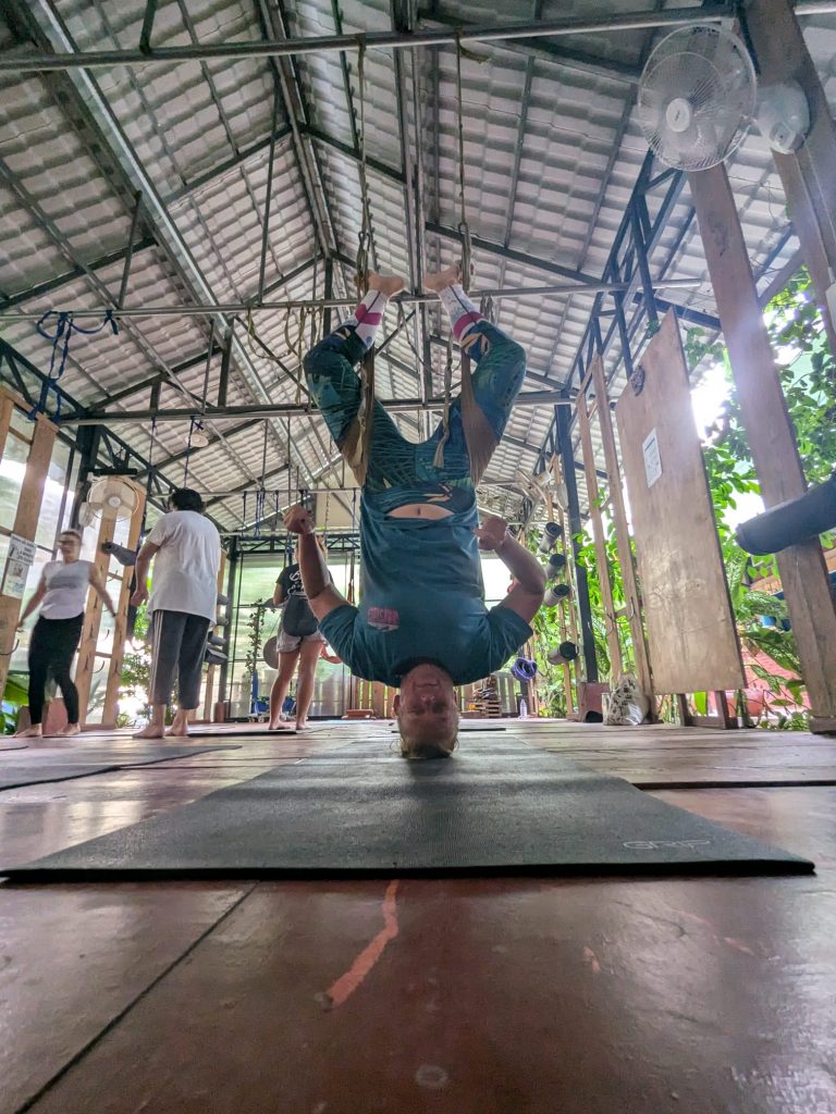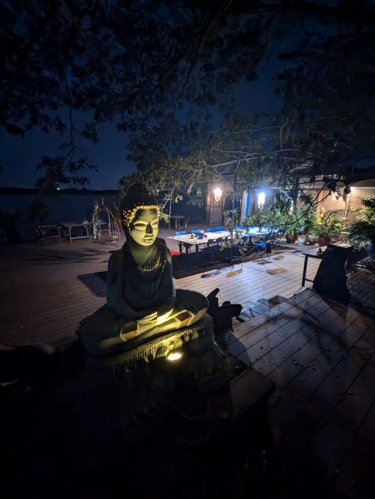 The session was pretty tough and cumilated with an extended fish pose. After the session I lay on my back staring up at the giant canopy of entwined branches above me, leaves gently fluttering. I heard a flip flop next to me and detected some movement on the edge of my vision. I span round and there next to me was a fish, about 5 inches along, alive and flopping across the deck which was raised in stilts 15 ft above the river bank. I have no idea where it came from and the owners had never seen a fish on the deck before. There was only one plausible explanation …….that I had manifested it with my excellent fish pose moments earlier. Either that or the cat stealthily dropped it next to my head. It had quite a few spines so I used a tongs to pick it up and launch it back off the deck into the mighty Mekong river.