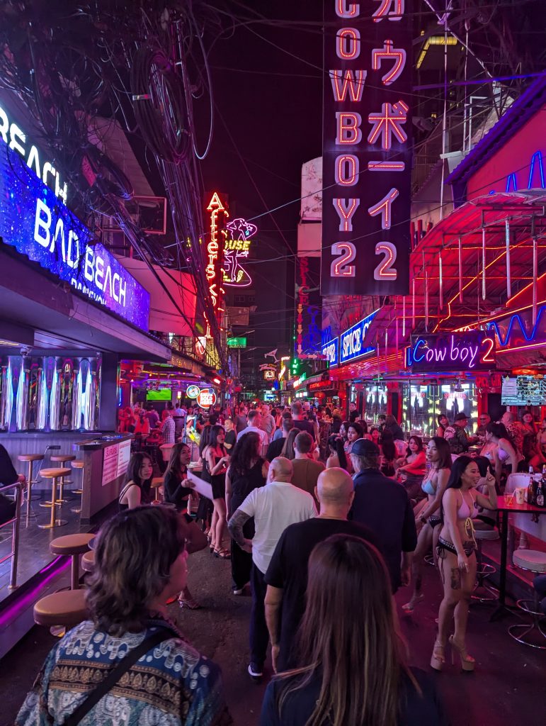 Weed was everywhere ……big glass jars of buds. Legally sold for ‘medicinal’ use, everybody appeared to have medical issues. But we did not see anybody smoking it, or smell any smoke which reenforced the advice to tourists that you can buy it, but don’t smoke it on the street, smoke it in private. Eventually curiosity overcame us and we went in a weed shop and laughed at the invented strain names on the ‘cocktail lists’ of options. Having given up smoking many moons ago we opted for some intermediate level weed gummies, paid the cashier, slipped one into my mouth and the rest into my pocket and stepped back out into the night, tired but wired by the sights and sounds. Either by chance ……or (Em’s) design we ended up turning into a packed neon alley filled 50/50 with single men/bikini clad girls that pawed at you as you passed (the girls not the men). They were all beautiful and the alley had an air of light hearted fun that almost covered the underlying sinister stones (the ones that appear if you leave your mind to really ask questions about what you are seeing). I think I held my breath for the whole of the alley as I tried to compute (and uncompute) what my eyes were seeing. I clutched my safety blanket more than once. It’s funny, in real life these alleys really engulf you in a way that cannot be captured by text or film, it was more like a tunnel with so much going on, so many individual people, just trying to comprehend the dynamics of the whole place and the lives there made the whole thing super intense.
