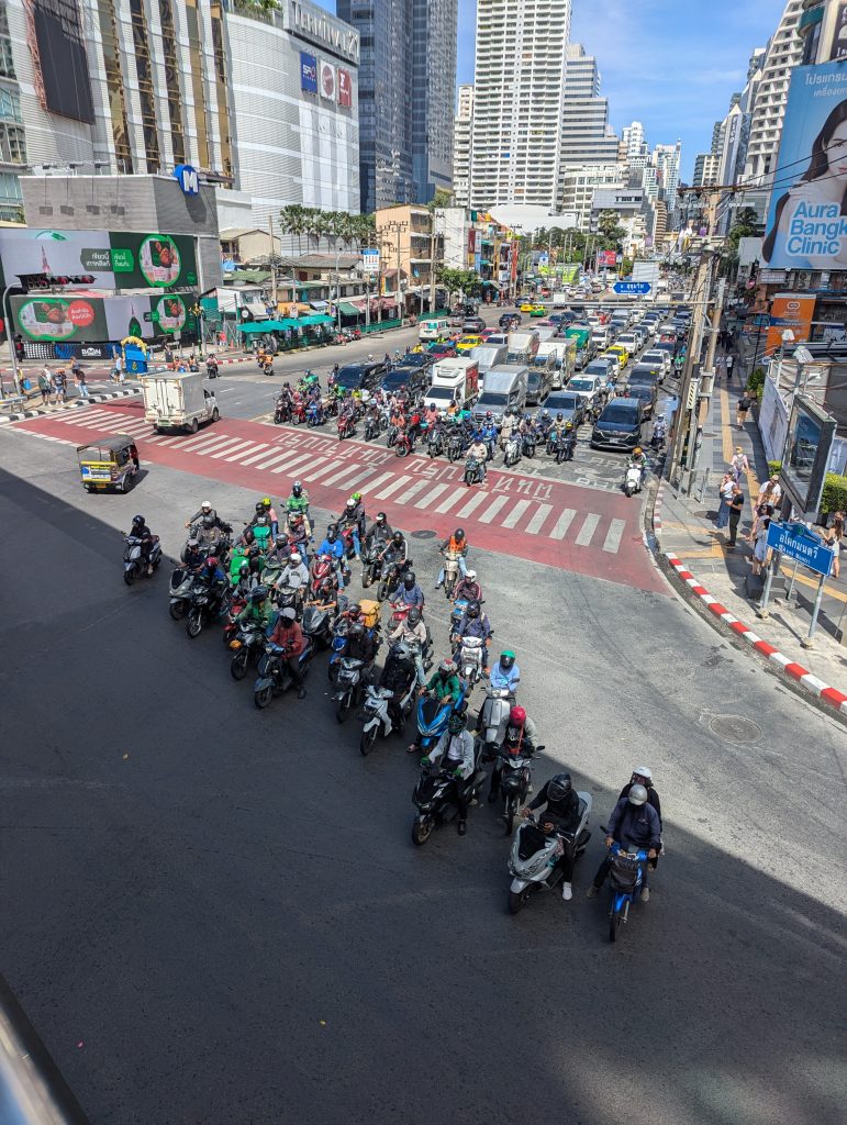 Our green and yellow car crawled out of the airport in a line of green and yellow traffic, the lanes either side of us multiplying over and over again. Now we were in our own travel show, locked in a taxi that’s locked in lanes of traffic as mopeds flowed past us through the tinniest of gaps, moving like magicians. Their uncrowned passengers visibly breathing in to assist moving past stationary busses. For 30 minutes I sat and gaped out of the window as we moved deeper into the city. Home felt like a 2-dimensional world where you rarely encounter buildings bigger than 3 storeys. As the buildings began to tower above us and a new 3-dimensional reality set in.  We stopped, for the 300th time and our driver announced we had arrived at our hotel. As soon as we stepped outside a Thai gentleman swept up our bags and beckoned us to follow, I thought the smoothness had ended and  we were being robbed but it turned out he worked at our hotel and he guided us across the busy street and into the air conditioned lobby where he did introduced himself as Sean (well, that’s what I heard but Em informed me his name was definitely not Sean) and advised he worked at the hotel. He laid down our bags at reception (it was strange letting someone carry my bag and I was a little uncomfortable about it) and we checked in. Sean immediately grabbed our bags again (so quickly that for a split second I again thought we were being robbed) and took us to our room, showed us around and then just stood there. I was ready for this moment, I knew what I had to do despite never being in this situation before! It was tip time! I had a sweaty note ready in my hand, it had been there for some time, I triumphantly and extravagantly handed it to Sean who was completely oblivious to the significance of this moment. Now, having successfully tipped a porter I was capable of climbing any mountain that life laid before me! For the record it was a 100 Baht tip (about £2.40) I was playing it safe, not being a flash Harry nor an Ebeneezer Scrooge (according to the all-knowing google A.I.).