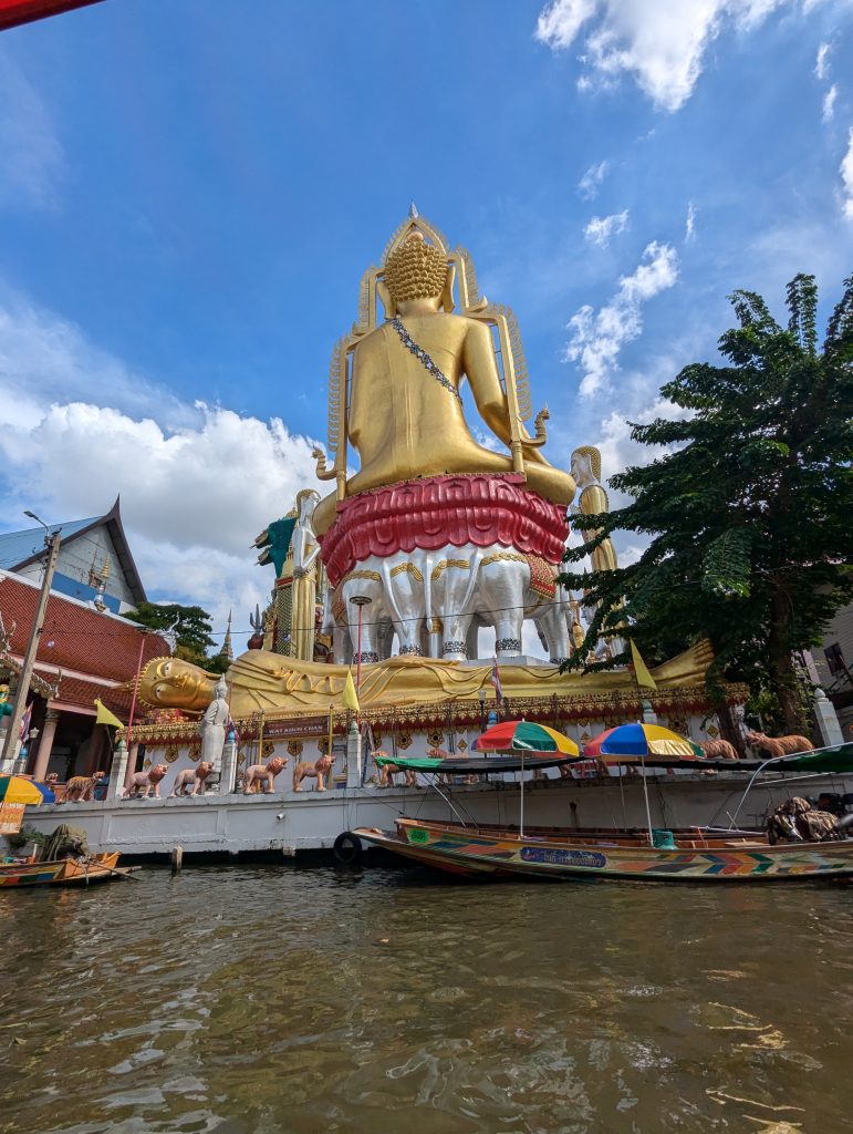 We passed many beautiful temples whose brightly painted red white and gold shone like stars of spirituality through the jumbled city. My first giant gold Buddha was mightily impressive despite having his back to us. We soon rejoined the main river through a busy lock…..where the boat became the sardine and we became a sardine scale. Back on the main channel there were boats of tourists flying everywhere and we crossed the channel cutting through the other floaters. Our captain expertly docked us at Chinatown and we debarked to continue the exploration.