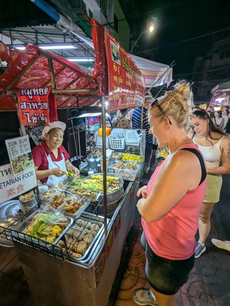 There were some personal highlights. First up was my first street vendor experience, a vegetable spring roll served in a plastic cup and drizzled with sweet chili sauce. I was pretty hungry and maybe this led me to declare this is the best spring roll EVER! Absolutely delicious. Buoyed by this success I went to the adjacent stall and the old Thai lady was happy to take my 60 baht in exchange for some deep fried sweet potato balls…..served in a plastic tub…..with sweet chili sauce…..and these were great but not good enough to topple the mighty spring roll. I wondered what her life story was as we continued our meander through the maze before stopping for  a drink  (iced latte for Em, violet lemon tea tea for me). We had some fresh pineapple from a street cart and Emma declared we were going for another massage.