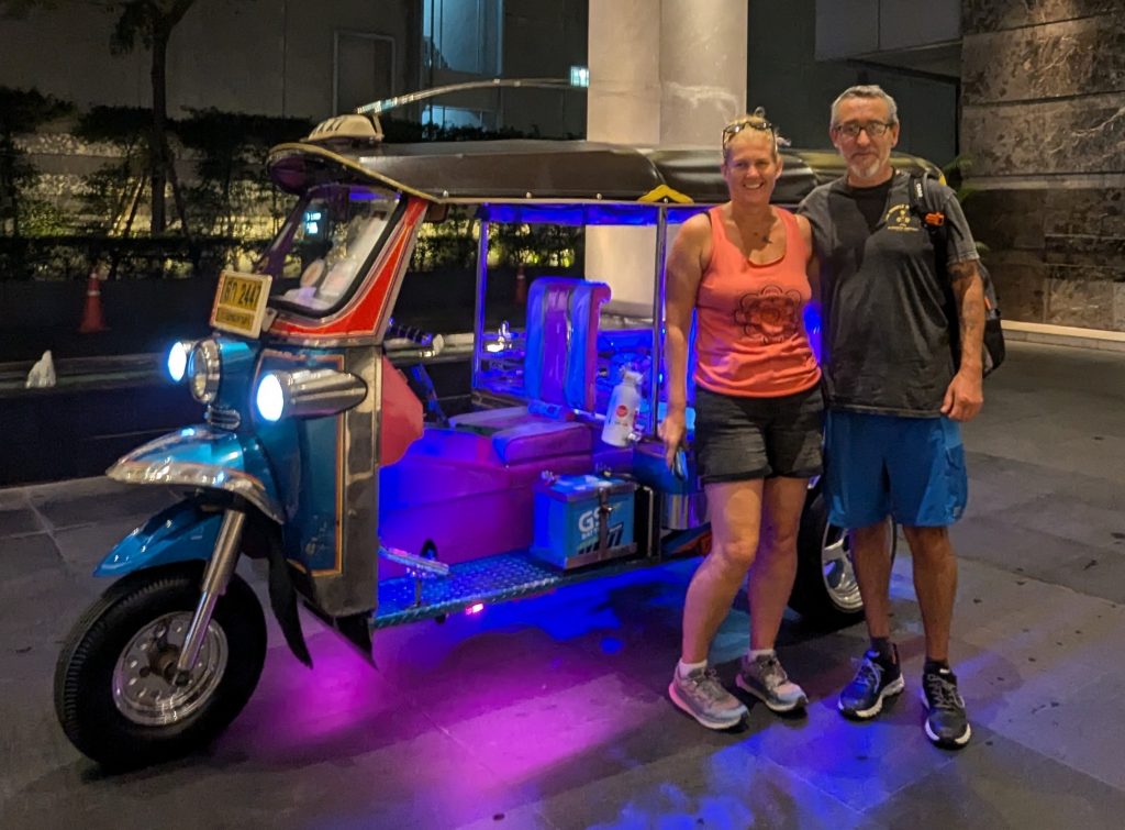 We shared a pad Thai which was good (but not great, according to Emma), mushroom Tom yum (Em requested not spicy) which was deliciously flavourful and somewhere at my top limit of spice processing capabilities. We also had a leaf wrap salad, with bright green spinach like leaves, a date or maybe fig jam, crispy tofu, peanuts, chili, ginger, lime and toasted coconut which were right little flavour bombs. All very delicious and activating some dormant taste buds at the back of my mouth. After food we went out into the dark and we committed to experiencing another tourist classic and fronted up to our first tuk tuk price bartering battle. Feeling confident (fed by my near perfect bow to our waiter earlier) I opened with ‘How much’ with my finger pointed at our hotel address lit up on Emma’s phone. Despite witnessing the extreme look of coldness in my eyes, or maybe because of it, Mr Tuk Tuk came straight in with a level 8 bartering move demanding a firm 450 baht. I immediately agreed and thereby lost my first (and possibly last) Tuk Tuk price battle.  We jumped on and noisily thupt thupted off into the night. At great speed, with no seat belts and no helmets, which was wild. Like the feeling you got when as a child you would ride your bike just a little bit too fast, the speed at which you knew if something bad would happen, it would be very bad indeed. It was absolutely amazing and I felt as free as a bird. We were then dropped at the hotel and went to a nearby roof top bar (30 floors up!) and enjoyed a drink whilst watching the city lights which  included a gym directly opposite us with a swimming pool (30 floors up!) We walked back to our hotel whilst munching on seaweed snacks, it was the end of a perfect day that I never would have imagined. We were now tired and our crisp hotel sheets awaited us just the other side of a 6 lane crazy road junction reminiscent of the 1980’s zx spectrum game ‘frogger’. I’d forgotten how exciting the simple act of crossing a road could be, and this was some road! arms raised in celebration we made it across……alive! Tomorrow we leave Bangkok behind and head South.